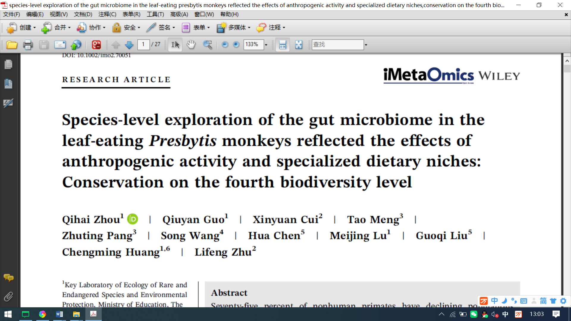近期,我室周岐海教授团队联合南京中医药大学等单位在iMetaOmics在线发表了题为“Species-level exploration of the gut microbiome in the leaf-eating Presbytis monkeys reflected the effects of anthropogenic activity and specialized dietary niches: conservation on the fourth biodiversity level”的文章。iMetaOmics作为iMeta(IF=33.2)子刊,发表生物技术、微生物组和生物信息学领域的相关学术论文。