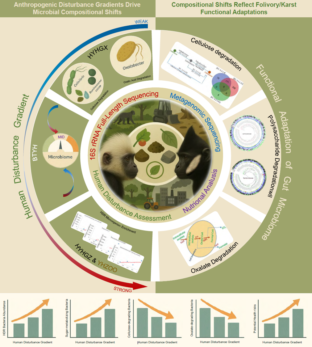 全球范围内,75%的非人灵长类动物种群数量下降,其主要原因是由人类干扰导致的森林砍伐和栖息地丧失。白头叶猴和黑叶猴是两种仅栖息于喀斯特森林的珍稀濒危灵长类动物。鉴于人类干扰对肠道微生物群落的负面影响,本研究采用多种方法(景观遗传学、营养分析、行为观察、237个样本的全长16S rRNA基因测序以及深度宏基因组测序),研究了两种野生叶猴在人类干扰下(以动物园作为最强干扰的参考)的肠道微生物组成和功能,并提出野生灵长类的保护不仅应关注宿主遗传多样性,还应关注人为干扰下共生微生物组的变化。