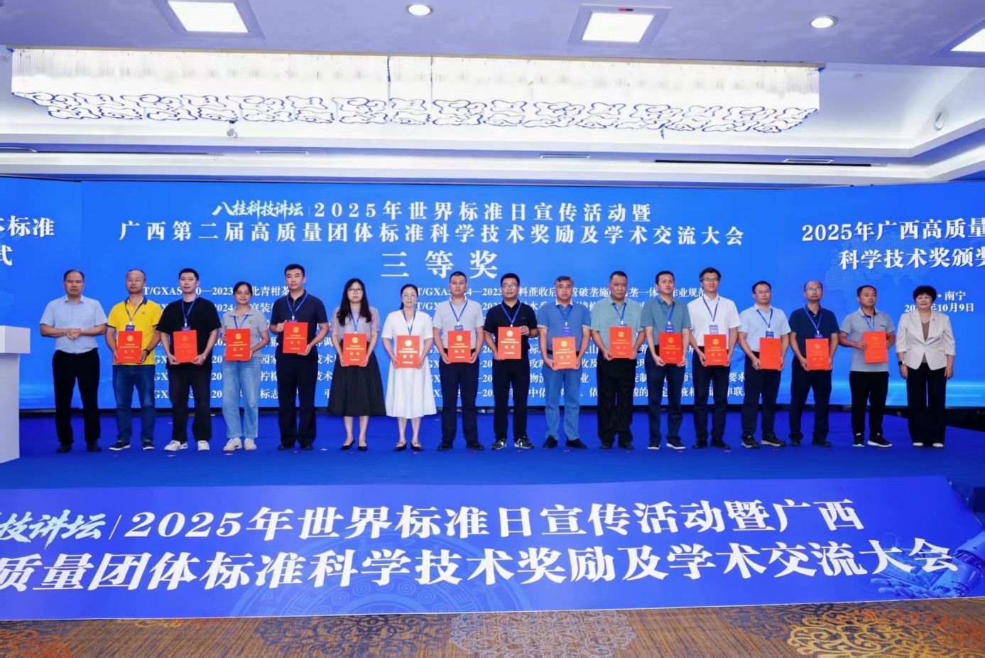 10月9日,2025年世界标准日宣传活动暨广西第二届高质量团体标准科学技术奖励及学术交流大会在南宁举行,本次大会由广西标准化协会主办。本次大会颁发了2025年广西高质量团体标准科学技术奖,由广西师范大学牵头,联合广西崇左白头叶猴国家级自然保护区管理中心、自治区公安厅森林警察总队等9家单位共同编制的《T/GXAS 740—2024白头叶猴野生种群调查规范》,荣获“广西标准化协会高质量团体标准科学技术奖三等奖”。我室周岐海教授代表编制团队上台领取获奖证书。