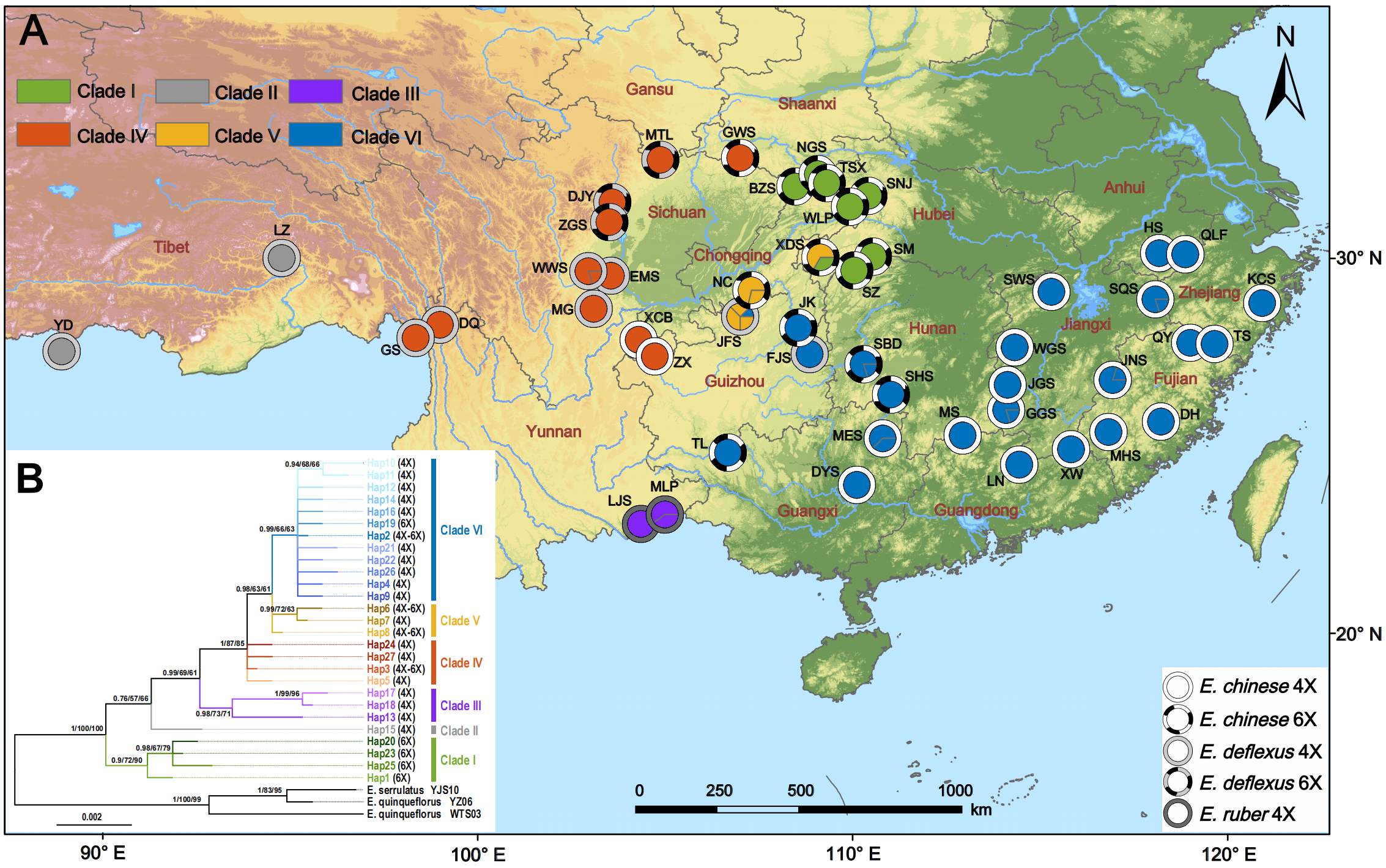 混合倍性物种(即包含不同染色体组数量的物种,如二倍体与多倍体)是研究进化过程的良好体系。以往研究表明,吊钟花属灯笼树物种复合体包含四倍体和六倍体居群,但该复合体内是否存在二倍体居群及其地理分布格局尚不明确。本研究首次采用流式细胞术评估细胞型分布,进而利用两个叶绿体基因间隔区(psbA-trnH 和 rpl32-trnL)探究该复合体的谱系地理结构及种群历史。结果显示:该复合体仅由四倍体和六倍体种群组成,未发现二倍体种群,暗示其二倍体祖先可能已灭绝或多倍化事件发生于中国亚热带地区之外。四倍体与六倍体呈现显著的空间分布隔离,可能源于其生态适应性的分化。共鉴定出27个叶绿体单倍型,形成6个异域分布的分支(分支I–VI)。基于有序单倍型的种群分化指数(NST)显著大于无序单倍型分化指数(GST),表明该复合体存在显著的谱系地理结构。分子钟分析显示6个分支在上新世晚期(约2.74百万年前)发生分化,提示吊钟花复合体的多样化可能早于第四纪,并存在于多个冰期避难所。历史种群动态分析发现两个分支(IV和VI)在末次冰期(分别约0.019和0.049百万年前)出现近期分布区扩张,这种扩张可能与末次冰期冷湿气候条件相关,符合"天空岛屿"生物(孤立山峰的高海拔生物)的分布模式。系统发育分析表明六倍体可能通过多次独立事件形成,而现存二倍体的缺失使四倍体起源难以追溯,需后续基因组学研究。本研究深化了对中国亚热带地区多倍体进化的认知,并为气候变化背景下的灯笼树复合体保护策略及种质资源利用提供了科学依据。