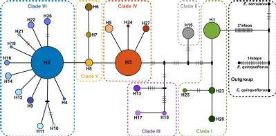 图2 灯笼树复合群叶绿体单倍型网络关系图