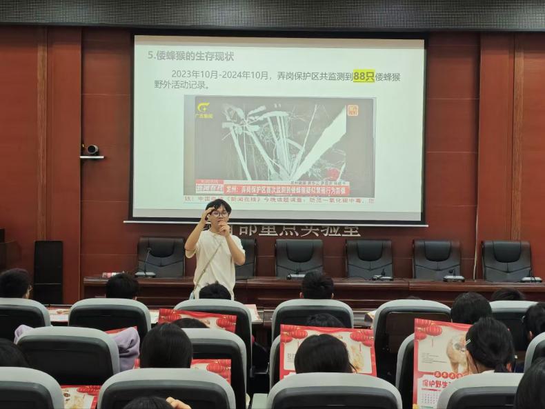 活动伊始,志愿者通过科普课堂将学生引入生物多样性的探索之旅。《大眼“毒”猴——倭蜂猴》课程内容充实,生动揭秘“小懒猴”倭蜂猴的独特习性,生动揭秘“小懒猴”倭蜂猴的独特习性,志愿者讲解方式幽默风趣,学生专注听讲,积极互动,两者结合一同将课程科普的作用最大化。