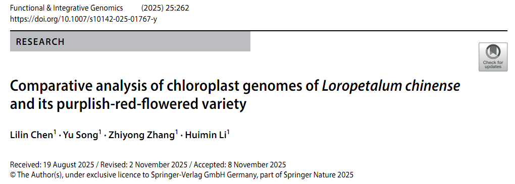 相关成果以题为“Comparative analysis of chloroplast genomes of Loropetalum chinense and its purplish-red-flowered variety”的论文形式,在线发表于基因组学领域期刊《Functional & Integrative Genomics》(中科院二区)。广西师范大学珍稀濒危动植物生态与环境保护教育部重点实验室为第一完成单位。我院2023级生物学专业硕士研究生陈丽琳为论文第一作者,张志勇教授与李惠敏副教授为共同通讯作者,宋钰教授也参与了研究工作。该研究获广西科技基地和人才专项—高层次创新人才和团队培养项目(2024AC43009)资助。
