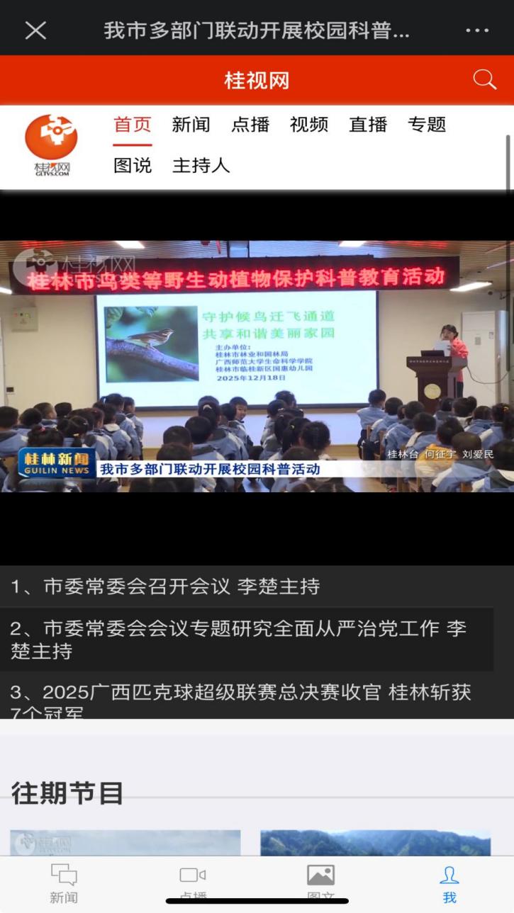 近日,桂林广播电视台以《我市多部门联动开展校园科普活动》为题,报道了广西师范大学生命科学学院联合桂林市林业和园林局、广西桂林花坪国家级自然保护区管理处等单位,在临桂新区国惠幼儿园及复兴学校开展“守护候鸟迁飞通道,共享和谐美丽家园”主题校园科普活动,展现出我院以多样化形式传播科学知识,助力青少年树立科学思维与生态保护意识。