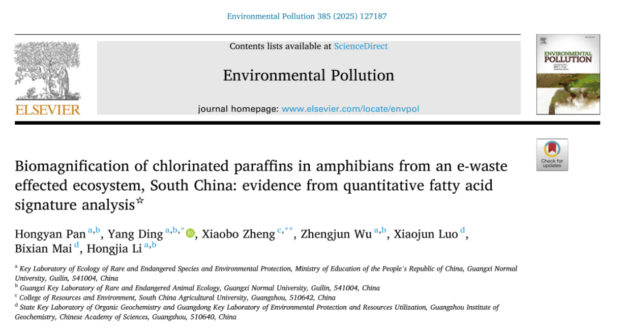 相关成果以“Biomagnification of chlorinated paraffins in amphibians from an e-waste effected ecosystem, South China: evidence from quantitative fatty acid signature analysis”为题,正式发表于环境科学领域期刊《Environmental Pollution》(中科院2区1)。广西师范大学珍稀濒危动植物生态与环境保护教育部重点实验室为第一完成单位,我院2023级硕士研究生潘鸿燕为论文第一作者,丁洋副教授与华南农业大学郑晓波教授为共同通讯作者,武正军教授、罗孝俊研究员和麦碧娴研究员参与了研究工作。该研究获国家自然科学基金(42307349、42177205)、广西自然科学基金(2025GXNSFBA069500)、广东省基础与应用基础研究基金(2020A1515110684、2024B1515020044)等项目资助。