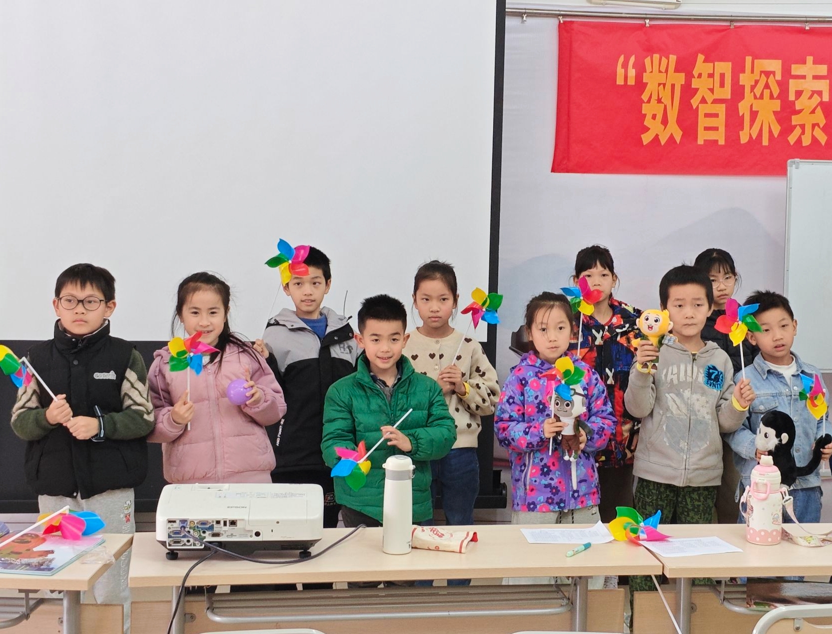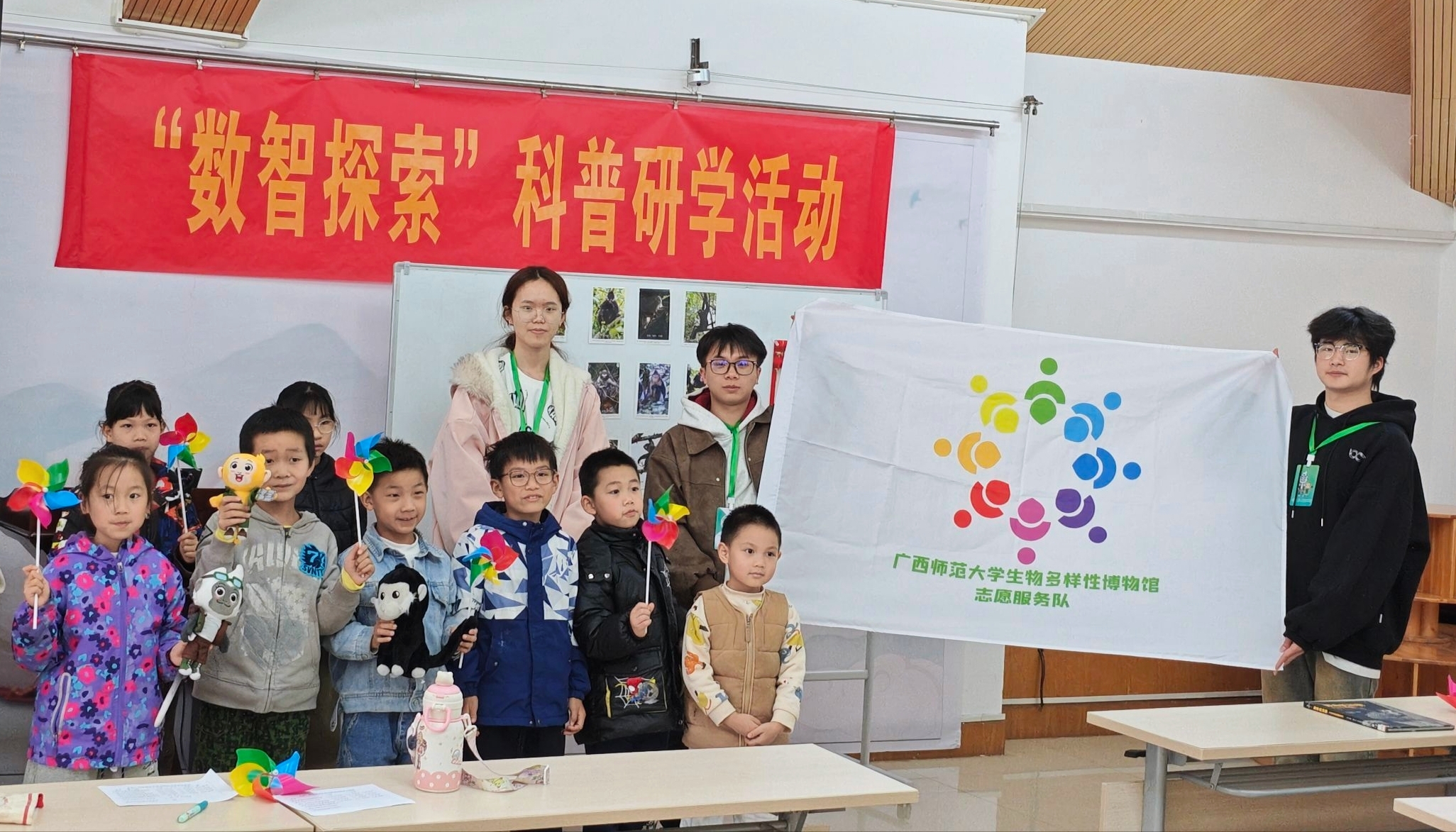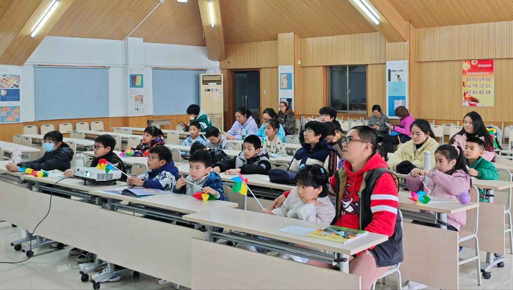 四节课程安排紧凑,志愿者在课间穿插了手工环节,带领孩子们制作简易风车。短暂的动手时间让孩子们得以放松,完成风车的孩子轻轻吹动叶片,脸上带着完成作品的笑意。课堂结束后,志愿者在展板前,与孩子们交流着刚学到的知识。