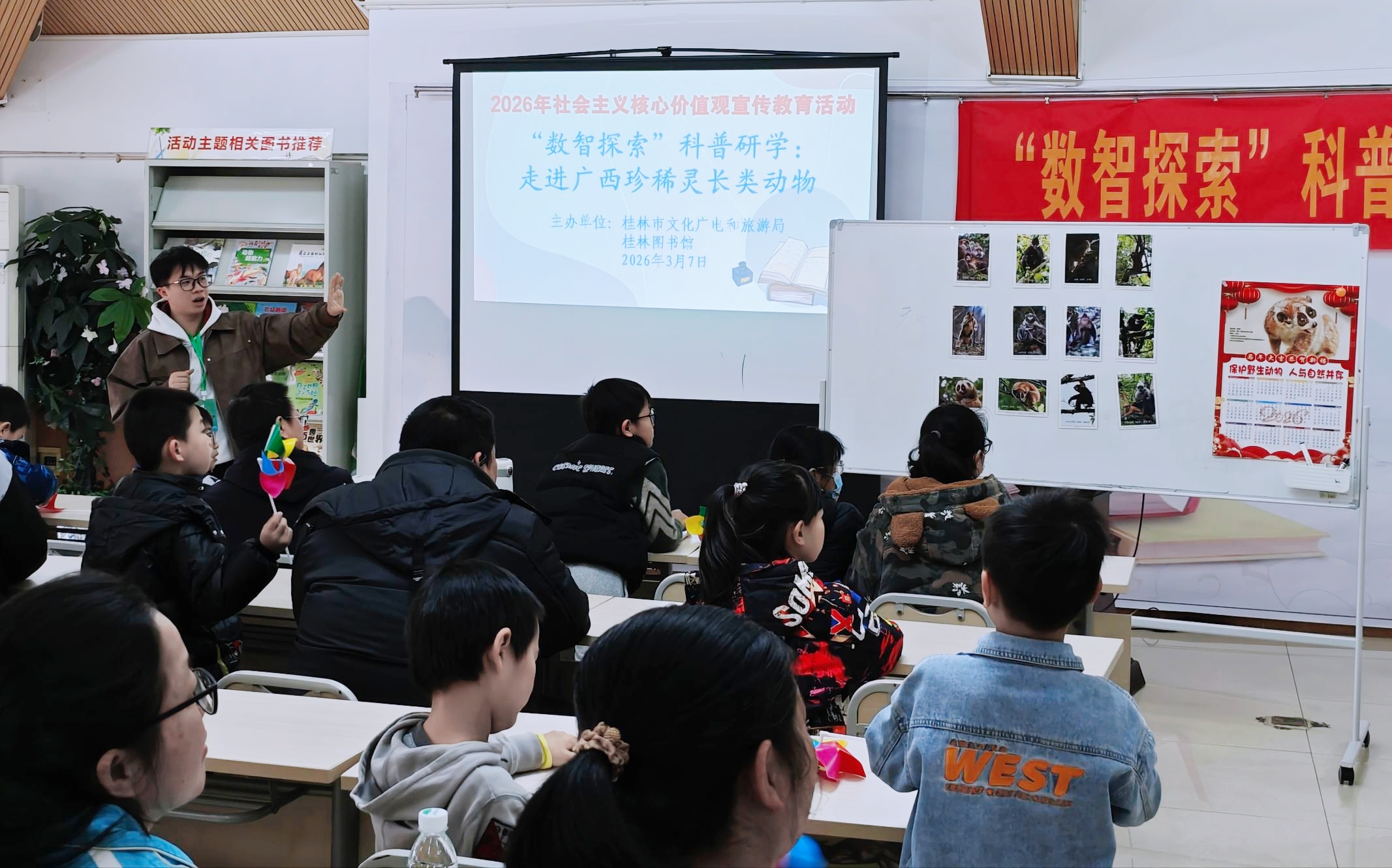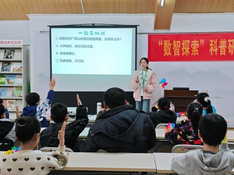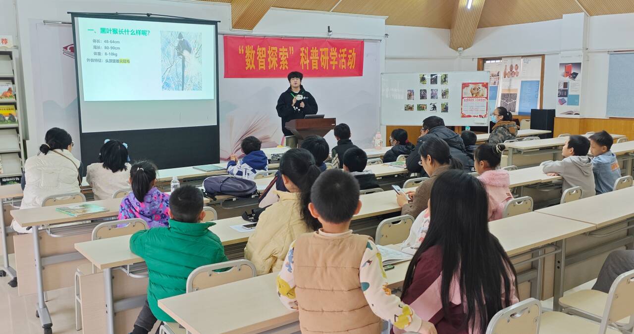 3月7日上午,广西师范大学生物多样性博物馆志愿服务队走进桂林图书馆,为少年儿童带来一场聚焦广西本土灵长类动物的科普课堂。活动以“探秘广西灵长类动物”为主题,选取黑叶猴、短尾猴、东黑冠长臂猿和猕猴四种分布在广西的灵长类物种,通过生动讲解与互动,带领小读者认识这些生活在家乡山林中的“邻居”。