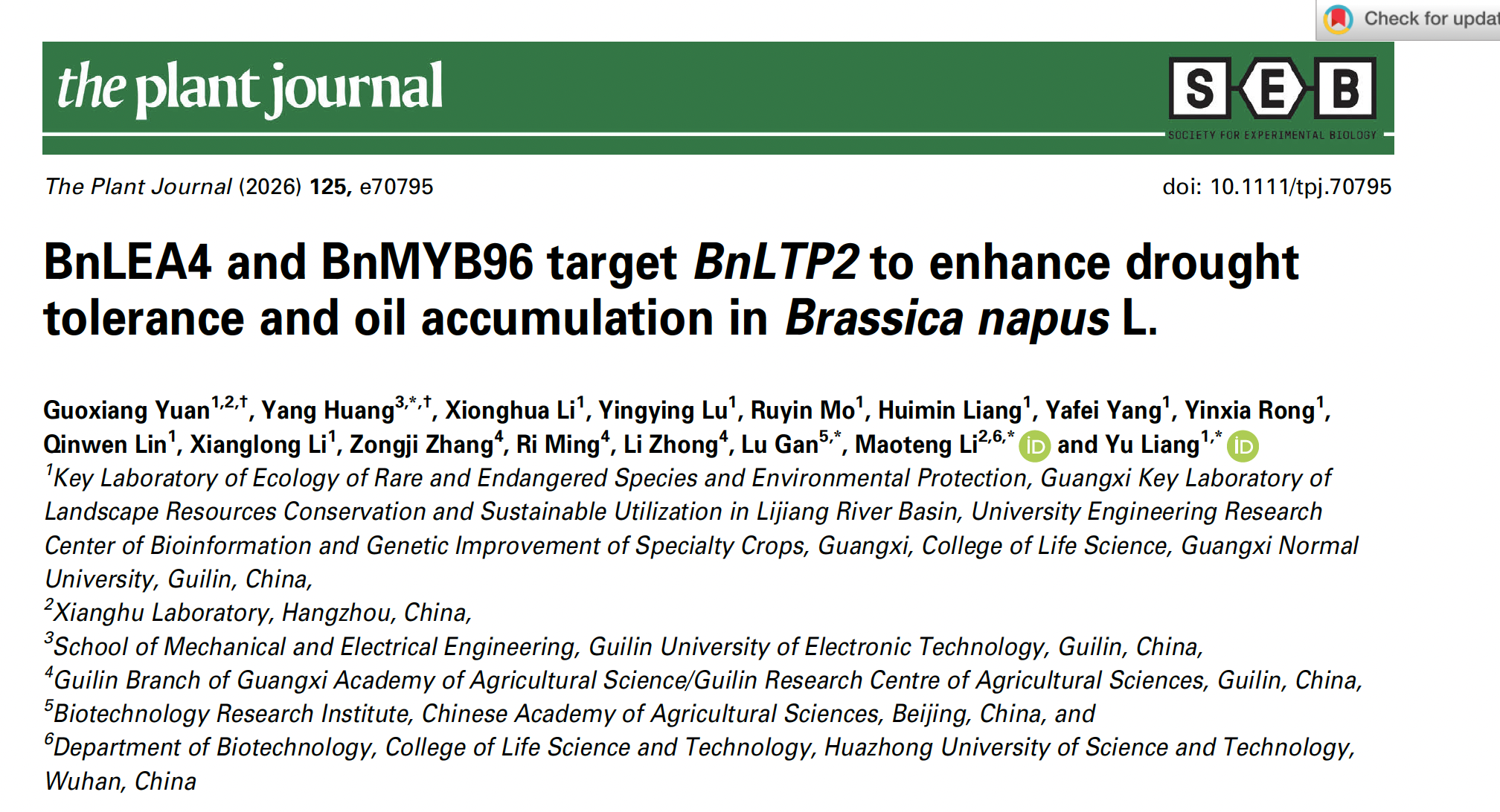 近日,植物学领域经典期刊《Plant Journal》(中科院1区TOP,2025分区表,五年影响因子7.1)在线发表了题为“BnLEA4 and BnMYB96 targeting BnLTP2 to enhance drought tolerance and oil accumulation in Brassica napus L.”的研究论文。该研究阐明了BnMYB96可与BnLEA4蛋白互作,并且作为转录因子结合BnLTP2的启动子,激活BnLTP2的表达,从而提升甘蓝型油菜干旱耐受性与种子含油量的分子机制,该研究为培育兼具耐旱性和高含油量的油菜新品种提供了关键理论依据和技术支撑。
