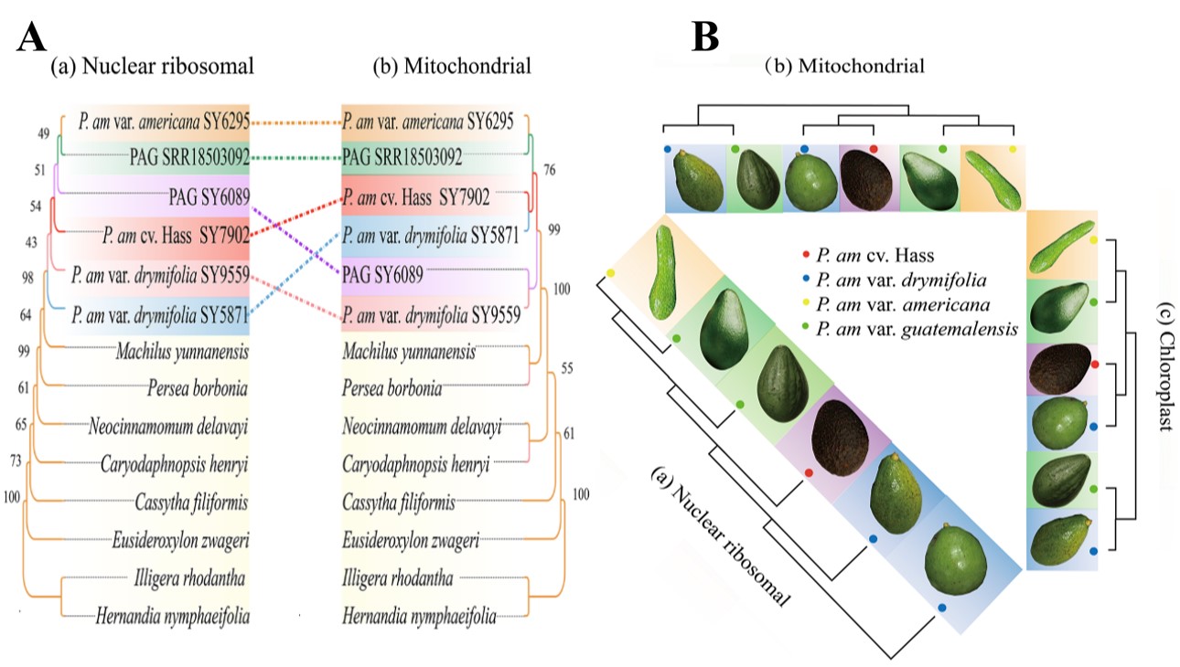 图2 鳄梨不同品系间的核质冲突A及其系统发育关系B