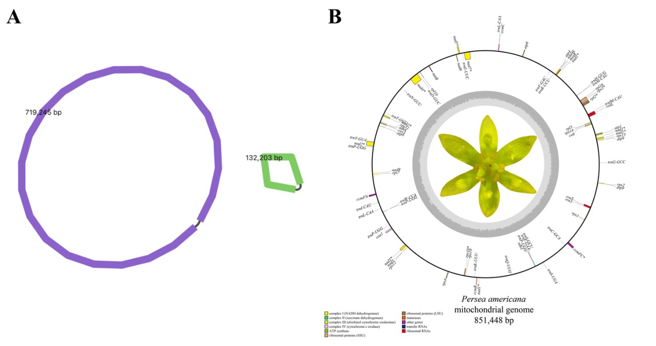 图1 鳄梨(Persea americana)的线粒体基因组组装图谱A和物理图谱B