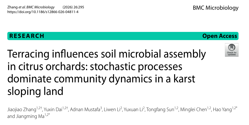 2026年3月31日,我院杨皓副教授课题组以题为“Terracing influences soil microbial assembly in citrus orchards: stochastic processes dominate community dynamics in a karst sloping land”的研究论文在《BMC Microbiology》(IF=4.5,2025中科院与2026新锐2区)在线发表。论文第一作者为课题组23级生态学硕士生张娇娇与22级生态学专业已毕业硕士戴雨昕(现为华东师范大学生态学博士)。杨皓副教授和马姜明教授为论文共同通讯作者。捷克布尔诺理工大学助理教授Adnan Mustafa也参与了本次研究,研究得到广西重点研发计划(GUIKE AB22080071)和广西科技重大专项(AA20161002)的资助。